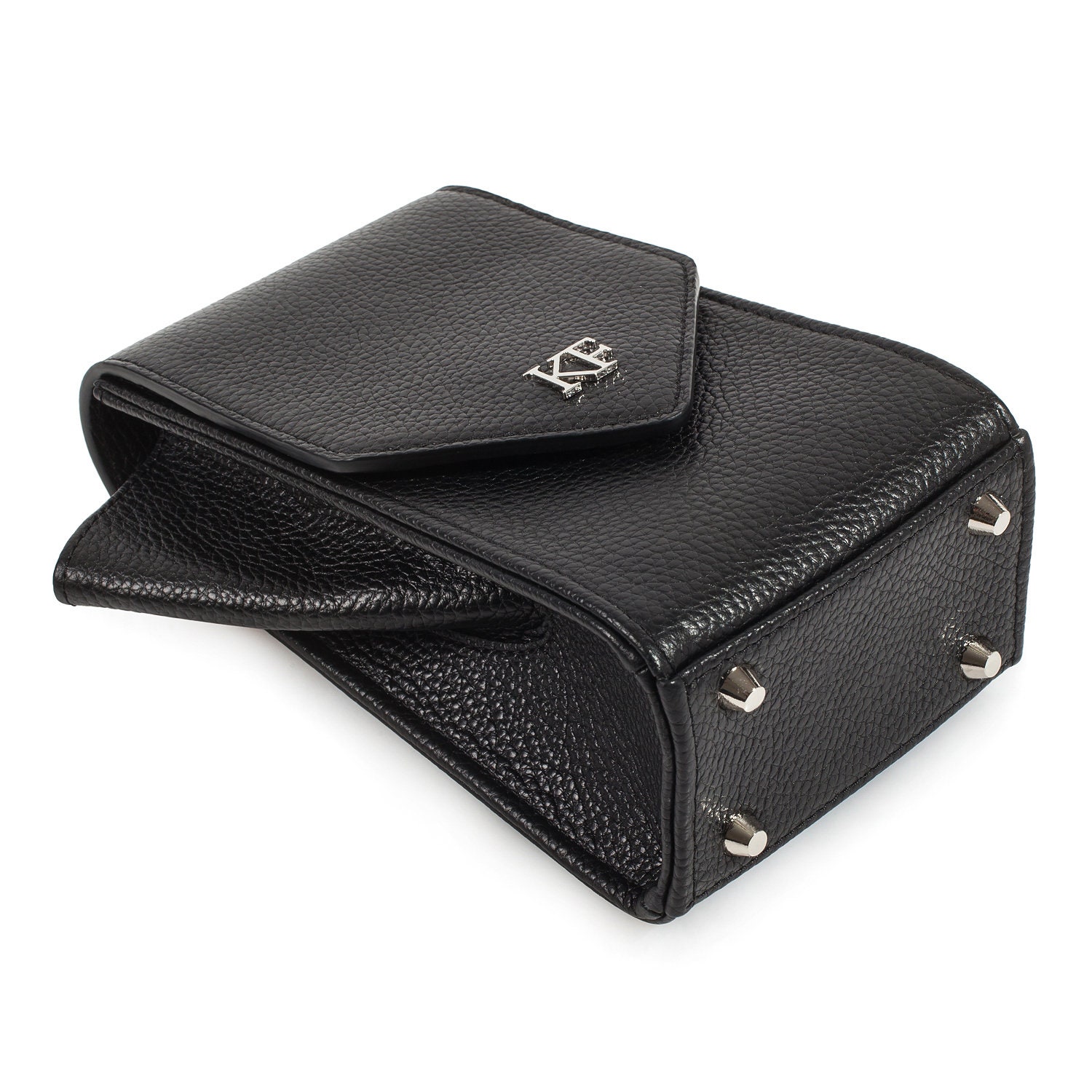 Black genuine leather woman crossbody bag from ukrainian designer Katerina Fox. Fashionable and elegant modern bag KF for bright girls and women. This bag is able to attract attention and highlight your exquisite taste. All accessories for Katerina Fox bags makes the same factory as for Michael §¬ors, Calvin Klein, DKNY and other famous brands.The internal space of a bag is equipped with one spacious compartment, four patch pockets for cards. The bag is closed on the button-magnet. The bag has a short removable handle on wrist.The length of the strap is adjustable. The kit also includes a storage bag.