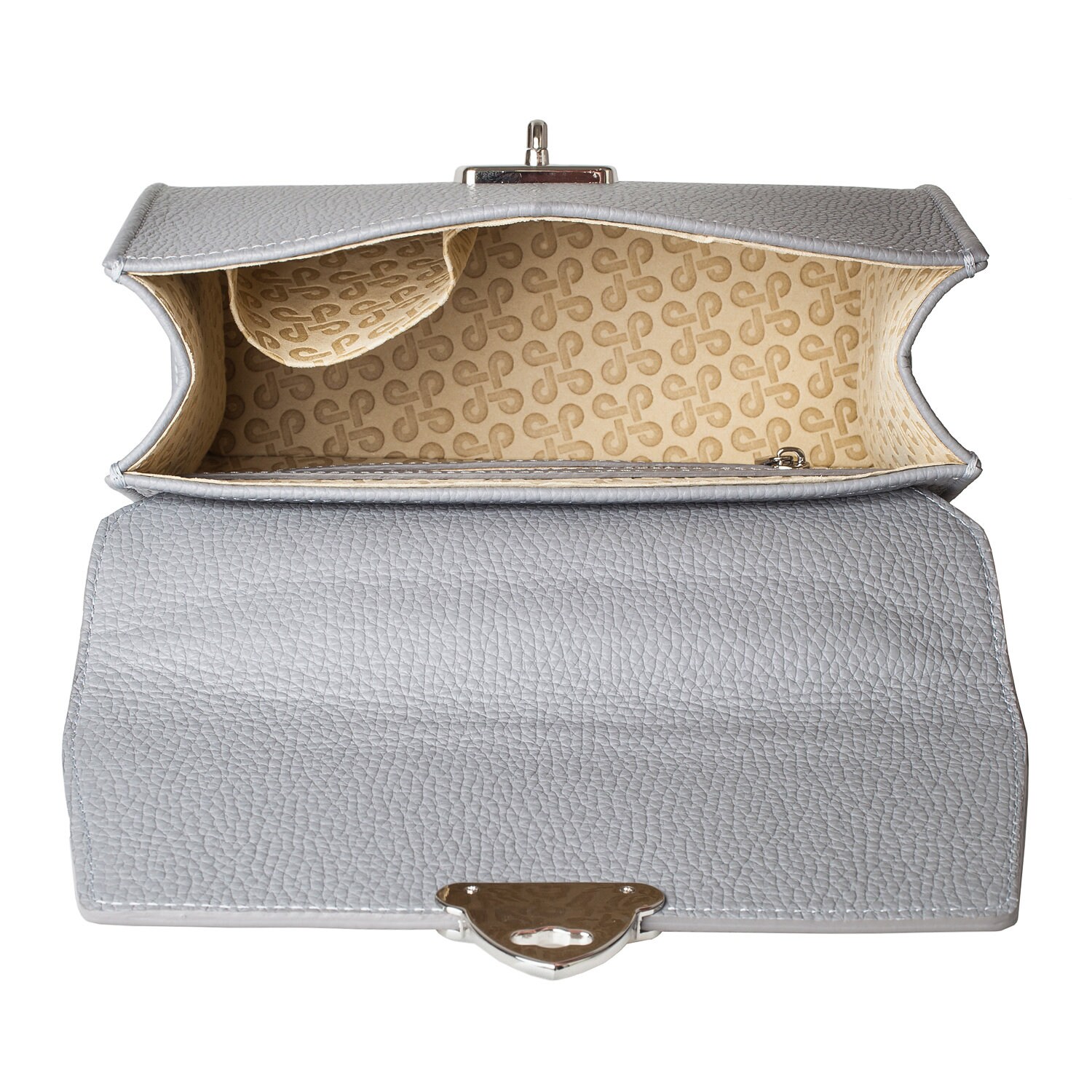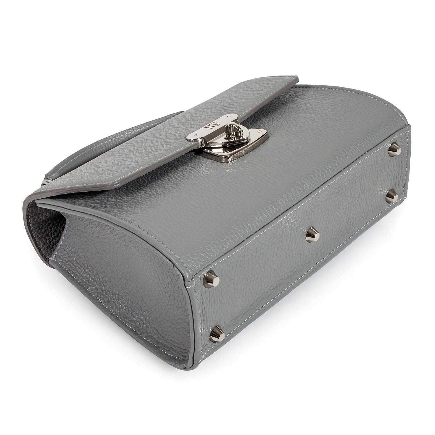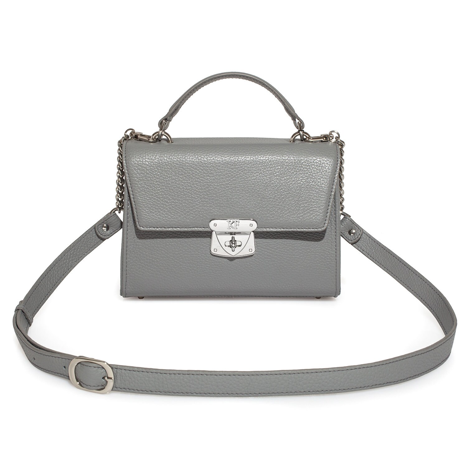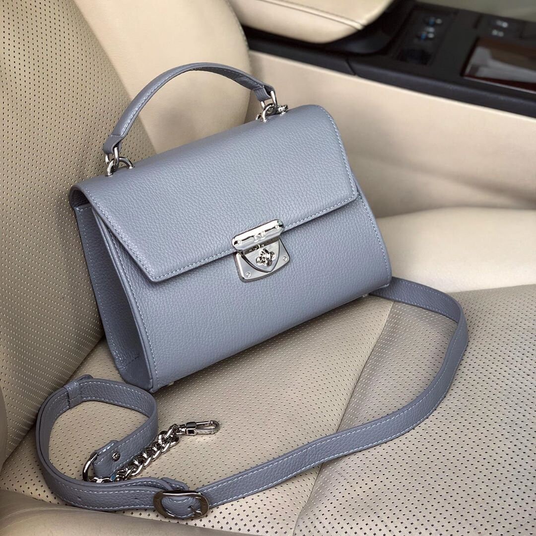 Gray genuine leather handbag from ukrainian designer Katerina Fox. The internal space of a bag is equipped with three spacious compartments and two patch-pockets and one zipper pocket. One of the spacious compartments is closed with a zipper. The bag is closed with a clasp. The bottom of the bag is protected with metal legs. There is a long handle that allows you to wear the bag on the shoulder. The kit also includes a storage bag.